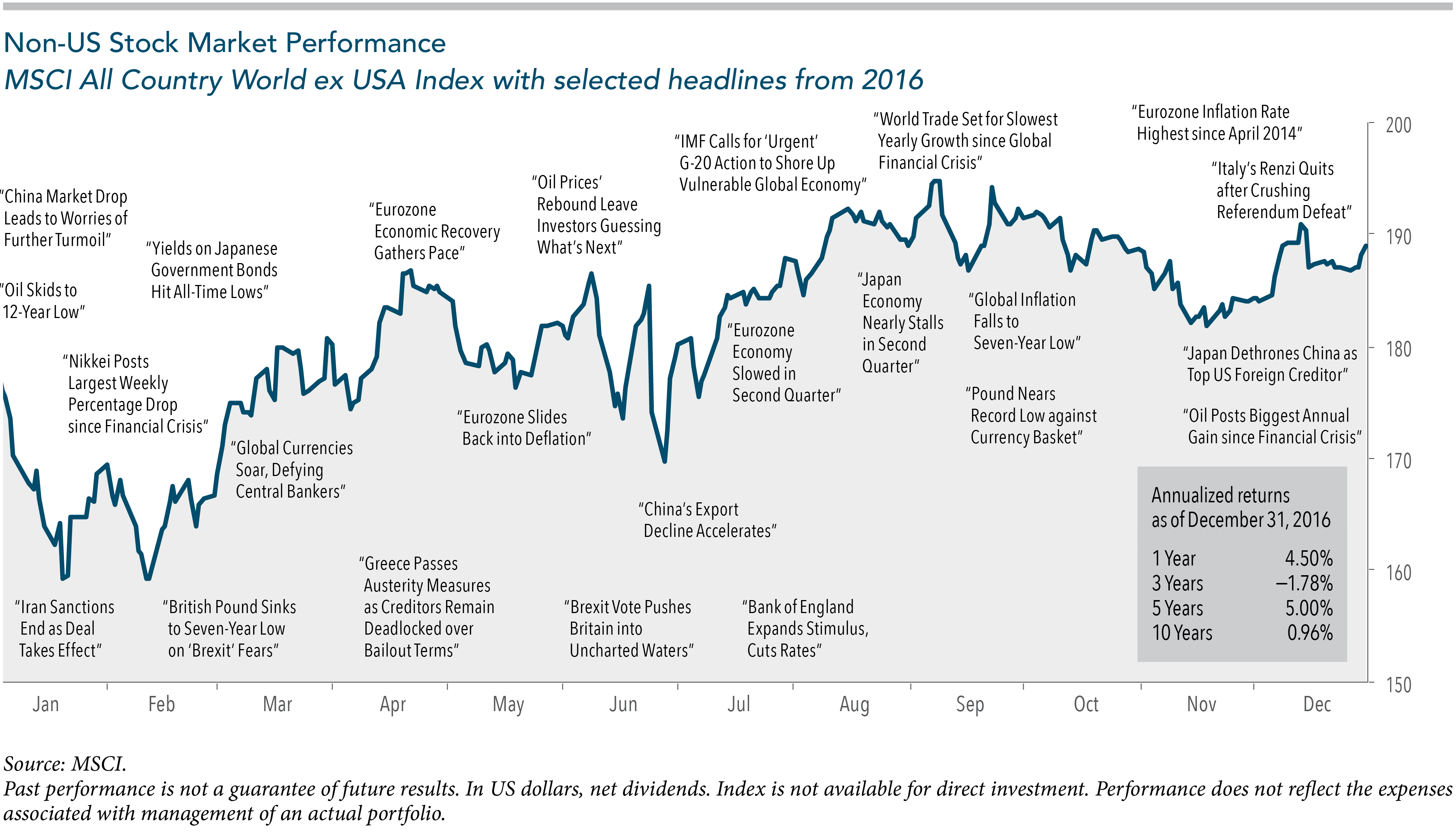 Look at these two charts recapping market activity and some news headlines in 2016. The first shows the Russell 3000, a good proxy for the U.S. stock market. The second is the MSCI All Country World Index ex USA, a proxy for the rest of the world. Both charts demonstrate how markets will go up and down, sometimes dramatically, but they do go up over time.