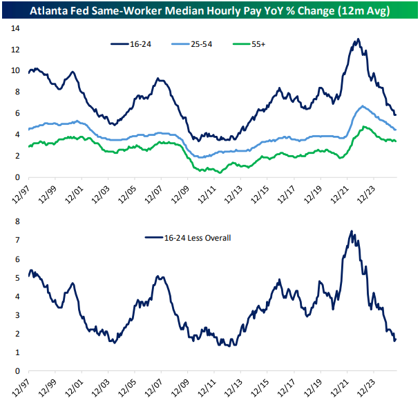 That same dynamic is still true today, but we do note that young workers are seeing weak relative wage growth. Their advantage in the Atlanta Fed data is similar to what we saw in the extremely weak labor market of the early 2010s when national unemployment was still in a 6%-10% range and aggregate wage growth was much weaker. We should probably discount some of the weakness given the “overshoot” of wage growth in the early 2020s, but by any measure this labor market is generating relatively weak wage growth for the youngest workers, which implies relatively soft aggregate income growth as well. In other words: something is going on.