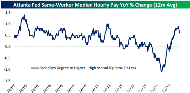 The hot 2020-2021 labor market may have been a taste of what is to come given the rising unemployment among college graduates. Until that period, it was extremely unusual for college-educated workers to see wages rise slower than those with less education. But lesseducated workers outperformed dramatically in that tight labor market. Normalcy has returned over the past couple of years but recent data shows college-educated workers starting to lose ground again.