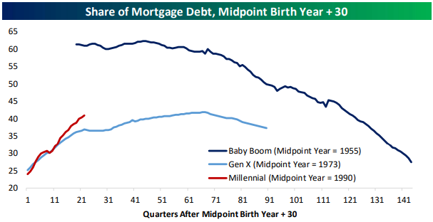 Assets also don’t account for the debt that underpins them and in that respect the share of mortgage debt held by Millennials is an indication that they are at somewhat of a disadvantage relative to older generations. As shown in the chart top right, share of mortgage debt is far higher than Gen X was at this point (though again, well below that of Baby Boomers).