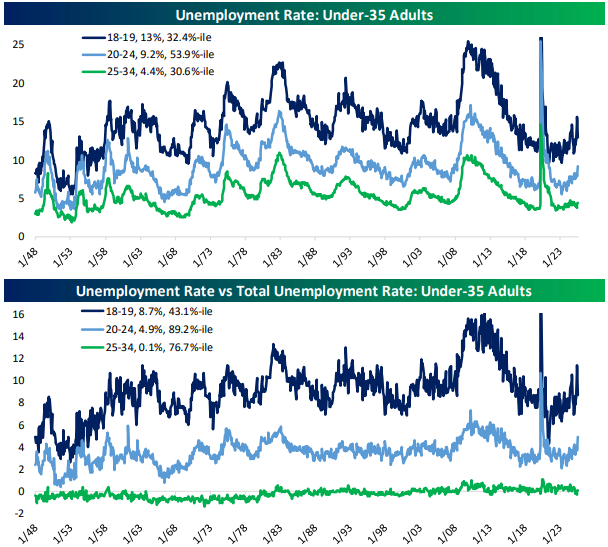 Recent announcements of job cuts from major companies have repeatedly come for the white collar labor force; in general this looks like reduced corporate head count with no impact on line or production workers. That helps illustrate a key dynamic in the labor market right now: the problem is less youth unemployment and more college educated unemployment. To illustrate, in the chart below we show the current percentile reading of unemployment relative to the national rate. Lower readings mean less joblessness for a given demographic relative to history and vice versa. As shown, for 16-24 year olds not enrolled in college and without a high school diploma, unemployment is historically low, in the bottom 4% of readings. Compare that to those not enrolled in college but with a high school degree, where unemployment is more elevated at the 70th percentile. And for 16-24 year-olds who are not enrolled in college having already earned a degree, unemployment relative to the national total is in the 95th percentile!