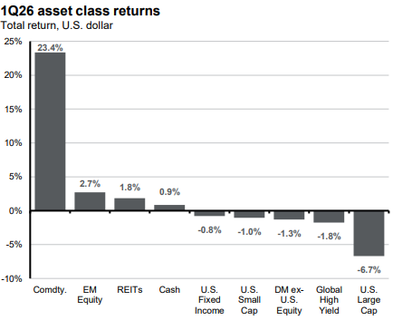 A reminder and interesting chart from JPMorgan this morning showing the lopsided returns so far this year… Last year’s rocky start [caused by the so-called Tariff Tantrum in early April 2025] faded quickly, with markets finishing strong — a reminder that in markets, winters are often short and summers long. Therefore, investors would be wise to use the recent dislocations in the market to position portfolios for structural growth themes that are likely to persist long after the conflict in the Middle East is resolved.