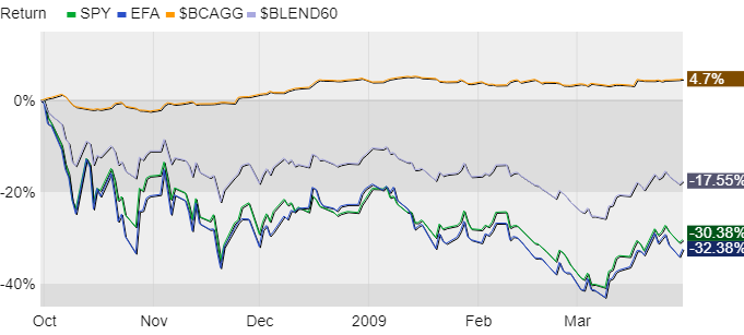 The first shows dates I cherrypicked from October 2008 through March 2009, the worst of the Great Financial Crisis. Owning the right kinds of bonds helped back then while the stock market was going nuts. It didn’t magically make your performance positive but took the edge off as shown in the spread below. Charts like this foster a certain amount of reliance on bonds as a source of strength within a portfolio.