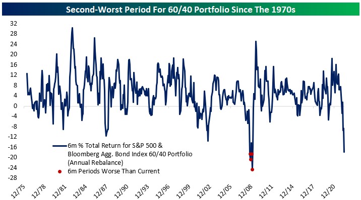 We hope decision-makers (like the Fed) and pundits saying that we still need to see a "market flush" truly appreciate the wealth destruction seen so far this year. [Last week], Chair Powell thought financial conditions including equity performance were "appropriately" tightening, signaling he and other FOMC policymakers are satisfied with the pain in stock and bond markets. For the "average" person that only has a 401k retirement plan that's set to a 60/40 allocation, they're now not only dealing with 8%+ CPI and $5/gallon at the pump, but also the biggest shock to their retirement portfolios since the worst stretches of the Financial Crisis. Not even during the Dot Com Crash of the early 2000s did we see a six-month decline of this magnitude in 60/40 portfolios.