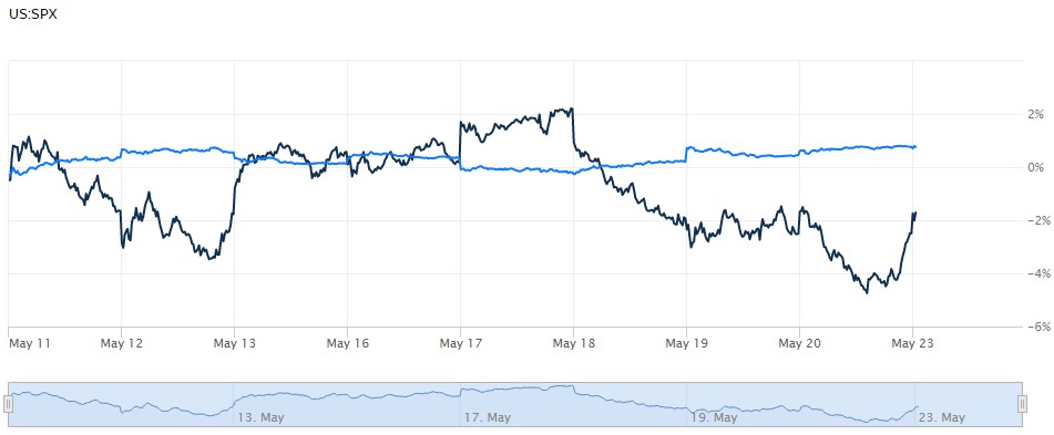 Now let’s look at this year so far, a year that among other things has turned into one about interest rates (kryptonite for bonds). We see bonds falling more or less in tandem with stocks and a lack of the positive spread shown in the chart above. There have been glimmers, but they haven’t held very long.