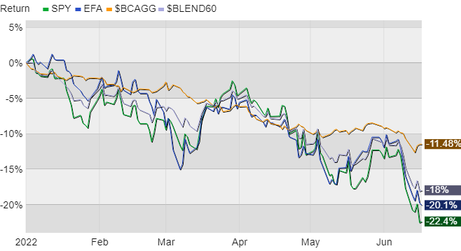 This has obviously been a bad year so far for long-term investors. Pick your asset class and it’s down year-to-date, and some are down much more than others. The real letdown, however, has been the bond market’s poor performance. We’ve talked about this and the reasons why before, but what’s interesting now that we’re near the halfway point this year is seeing how bond returns have impacted the traditional 60/40 stock/bond mix that is so prevalent across portfolios.
