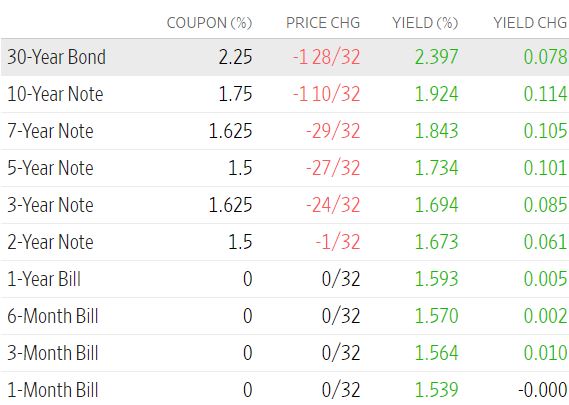 If you’re interested, here’s a list of yields from the Wall Street Journal as the bond market closed on Friday. You’ll see the yield percentage being higher with the 30yr bond and then declining at each separate maturity step down to one month. This is what a normally sloped yield curve looks like, albeit with historically low rates across the board. Flip this around and make the shorter maturities yield more than longer-term and you’ll get a sense of how backwards yield curve inversions can look.