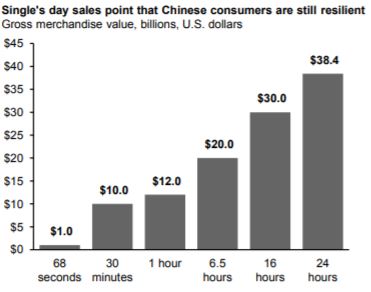 Last year Singles’ Day sales were almost $31 billion. This year Chinese consumers spent $38 billion and, according to JPMorgan, surpassed in less than 12 hours the $24 billion US consumers spent last year during our five-day Black Friday weekend. The chart below, again from JPMorgan, shows how sales increased as the day went on. Granted, China has about a billion more people than we do, but they still spent more than us proportionally.