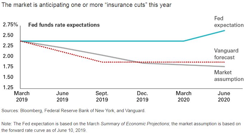 Additionally, Vanguard just released an update to their economic expectations suggesting so-called “insurance cuts” from the Fed. Vanguard’s idea is that given the mixed state of the economy here and abroad, as well as the aforementioned trade tensions, the Fed cutting rates a little to keep the economic engine grooving along makes a lot of sense.