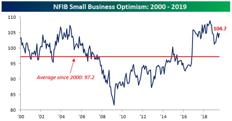 So, in an environment where individual investors are bearish, business owners are growing more bullish, even amid all the trade-related uncertainty we keep hearing about. Part of the reason for this is that “poor sales” is among the lowest concerns for small business owners. We hear about this on the corporate side as well. Walmart recently reported strong earnings from what the company sees as a strong consumer. That speaks well for our economy fending off recession for a while. Remember, ours is a consumption-based economy, so if people continue spending without racking up too much debt, the wheels can keep turning.
