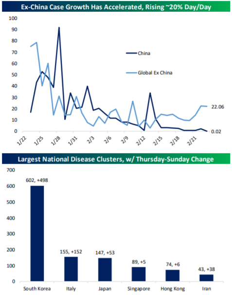 The problem with this headline analysis, and the biggest reason that the S&P 500 is trading down 2.5% this morning, is that the legitimate and material improvements in China are masking rapid growth in the number of cases outside of China. Saturday and Sunday both showed cases growing more than 20% sequentially. Established disease clusters in Hong Kong and Singapore where there have been active cases since January 23 are not growing rapidly but in Italy, South Korea, and to a lesser extent Japan, the case count is exploding. These industrial economies with robust public health infrastructure all have the ability to manage even large outbreaks, albeit at great economic cost.