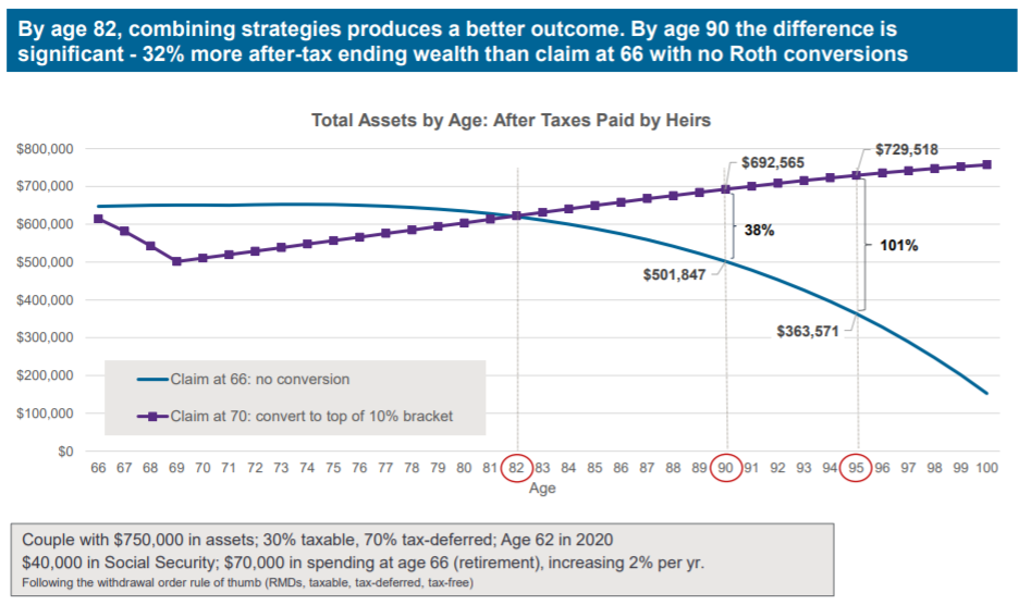 The rub here is that bracket creep is always possible, so you’ll want to look at conversions when you’re having a low-income year. The idea is to do conversions incrementally while staying in your typical tax bracket. Maybe it’s now due to the coronavirus. Or maybe it’s done as part of a more creative plan to retire earlier, live off other savings, delay Social Security until age 70, and do Roth conversions aggressively during the years between. This kind of thing can make a serious dent in future taxable income, reduce total taxes paid, and leave money in your retirement accounts longer. The chart below from JPMorgan illustrates how a retiree’s balance could behave while following this approach.