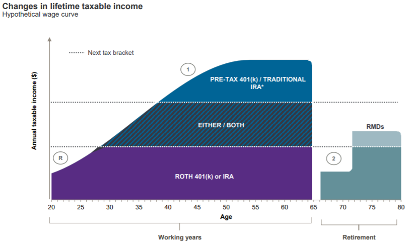 But this is changing as retirement researchers (and your humble financial planner) question some of the industry’s core assumptions. For example, researchers at JPMorgan demonstrate how the younger someone is and the lower their tax bracket, the more value they get from Roth accounts. Savers should only think about contributing to a traditional account as they age and make more money (and pay more taxes). The following chart illustrates this.