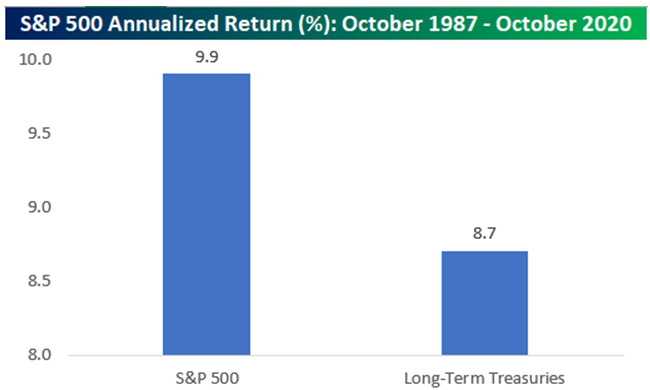 To further illustrate this point, let's take the theoretical example of the person who plowed some money into the stock market on the day before the crash. From a timing perspective, it couldn't have been worse. With the benefit of time, though, an investor who held on for the ride actually fared pretty well even outperforming long-term Treasuries. As shown in the chart below, the S&P 500's annualized total return from the Friday before the '87 crash through this past Friday works out to just under 10% at 9.9%. Long-term US Treasuries have also performed well over the same time period, but with an annualized gain of 8.7%, they've underperformed the S&P 500.