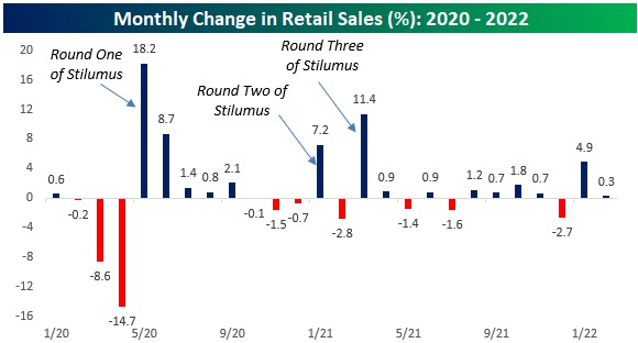 Regardless of your opinions regarding the effectiveness of various federal and state government COVID policies, there is no question that restrictions on activity (both enforced and voluntary) along with the stimulus provided by the federal government and the Federal Reserve dramatically altered the course of the economy. Whether it's elevated levels of inflation, supply chain constraints, or labor shortages, many of the headwinds our economy faces today can be attributed to the pandemic. In 2019, a Federal Reserve survey found that nearly 40% of Americans wouldn't be able to cover a financial 'emergency' of even $400. Two years after a catastrophic pandemic that sent the unemployment rate surging from 3.5% up to 14.8% in just two months, consumer balance sheets are now healthier than they were pre-pandemic. The various stimulus programs meant to combat the pandemic created massive waves of demand, and it's no coincidence that after each of the three rounds of stimulus checks hit consumer accounts, Retail Sales surged.