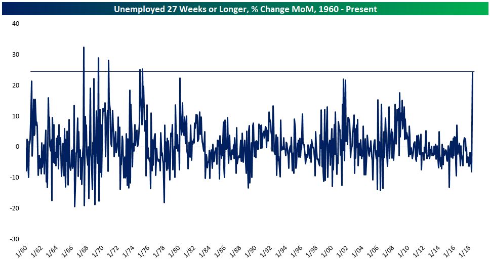 The following chart from my research partners at Bespoke Investment Group illustrates this point. Now that these folks have started looking for work they get counted as "unemployed" by the BLS. This means they make it into the headline number and, viola, the unemployment rate goes up! (In case you miss it, it's the blue line all the way at the right of the chart - it's so straight it looks like a border!)